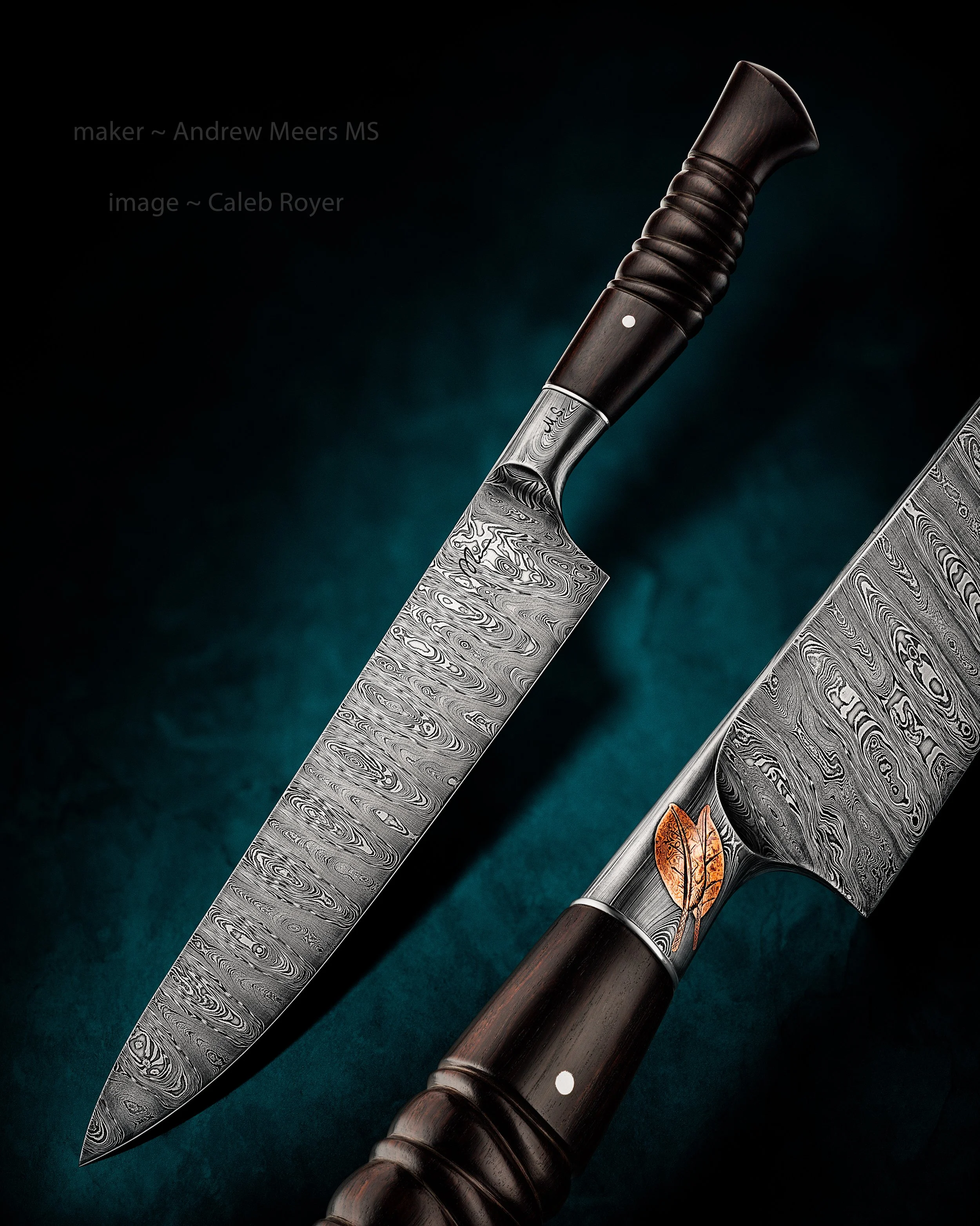 12” damascus blade, african blackwood handle, copper tomato inlay